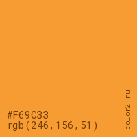Цвет #F69C33 в цветовой модели RGB обозначается тремя октетами (246, 156, 51) в десятичном формате и #F69C33 в шестнадцатиричном (hex) формате, которые являются интенсивностью красного 246 (hex F6), интенсивность зелёного 156 (hex 9C) и интенсивность синего 51 (hex 33).