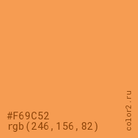 Цвет #F69C52 в цветовой модели RGB обозначается тремя октетами (246, 156, 82) в десятичном формате и #F69C52 в шестнадцатиричном (hex) формате, которые являются интенсивностью красного 246 (hex F6), интенсивность зелёного 156 (hex 9C) и интенсивность синего 82 (hex 52).