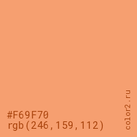 Цвет #F69F70 в цветовой модели RGB обозначается тремя октетами (246, 159, 112) в десятичном формате и #F69F70 в шестнадцатиричном (hex) формате, которые являются интенсивностью красного 246 (hex F6), интенсивность зелёного 159 (hex 9F) и интенсивность синего 112 (hex 70).