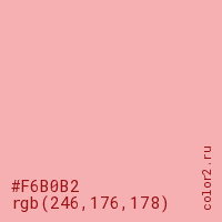 Цвет #F6B0B2 в цветовой модели RGB обозначается тремя октетами (246, 176, 178) в десятичном формате и #F6B0B2 в шестнадцатиричном (hex) формате, которые являются интенсивностью красного 246 (hex F6), интенсивность зелёного 176 (hex B0) и интенсивность синего 178 (hex B2).