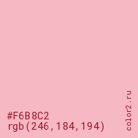 Цвет #F6B8C2 в цветовой модели RGB обозначается тремя октетами (246, 184, 194) в десятичном формате и #F6B8C2 в шестнадцатиричном (hex) формате, которые являются интенсивностью красного 246 (hex F6), интенсивность зелёного 184 (hex B8) и интенсивность синего 194 (hex C2).
