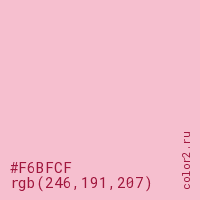 Цвет #F6BFCF в цветовой модели RGB обозначается тремя октетами (246, 191, 207) в десятичном формате и #F6BFCF в шестнадцатиричном (hex) формате, которые являются интенсивностью красного 246 (hex F6), интенсивность зелёного 191 (hex BF) и интенсивность синего 207 (hex CF).