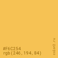 Цвет #F6C254 в цветовой модели RGB обозначается тремя октетами (246, 194, 84) в десятичном формате и #F6C254 в шестнадцатиричном (hex) формате, которые являются интенсивностью красного 246 (hex F6), интенсивность зелёного 194 (hex C2) и интенсивность синего 84 (hex 54).