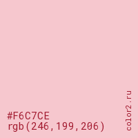 Цвет #F6C7CE в цветовой модели RGB обозначается тремя октетами (246, 199, 206) в десятичном формате и #F6C7CE в шестнадцатиричном (hex) формате, которые являются интенсивностью красного 246 (hex F6), интенсивность зелёного 199 (hex C7) и интенсивность синего 206 (hex CE).