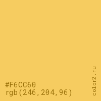Цвет #F6CC60 в цветовой модели RGB обозначается тремя октетами (246, 204, 96) в десятичном формате и #F6CC60 в шестнадцатиричном (hex) формате, которые являются интенсивностью красного 246 (hex F6), интенсивность зелёного 204 (hex CC) и интенсивность синего 96 (hex 60).