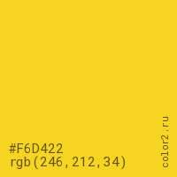 Цвет #F6D422 в цветовой модели RGB обозначается тремя октетами (246, 212, 34) в десятичном формате и #F6D422 в шестнадцатиричном (hex) формате, которые являются интенсивностью красного 246 (hex F6), интенсивность зелёного 212 (hex D4) и интенсивность синего 34 (hex 22).