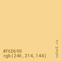 Цвет #F6D690 в цветовой модели RGB обозначается тремя октетами (246, 214, 144) в десятичном формате и #F6D690 в шестнадцатиричном (hex) формате, которые являются интенсивностью красного 246 (hex F6), интенсивность зелёного 214 (hex D6) и интенсивность синего 144 (hex 90).