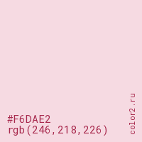 Цвет #F6DAE2 в цветовой модели RGB обозначается тремя октетами (246, 218, 226) в десятичном формате и #F6DAE2 в шестнадцатиричном (hex) формате, которые являются интенсивностью красного 246 (hex F6), интенсивность зелёного 218 (hex DA) и интенсивность синего 226 (hex E2).