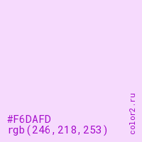 Цвет #F6DAFD в цветовой модели RGB обозначается тремя октетами (246, 218, 253) в десятичном формате и #F6DAFD в шестнадцатиричном (hex) формате, которые являются интенсивностью красного 246 (hex F6), интенсивность зелёного 218 (hex DA) и интенсивность синего 253 (hex FD).