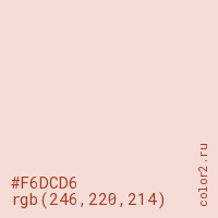 Цвет #F6DCD6 в цветовой модели RGB обозначается тремя октетами (246, 220, 214) в десятичном формате и #F6DCD6 в шестнадцатиричном (hex) формате, которые являются интенсивностью красного 246 (hex F6), интенсивность зелёного 220 (hex DC) и интенсивность синего 214 (hex D6).