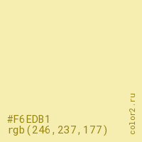 Цвет #F6EDB1 в цветовой модели RGB обозначается тремя октетами (246, 237, 177) в десятичном формате и #F6EDB1 в шестнадцатиричном (hex) формате, которые являются интенсивностью красного 246 (hex F6), интенсивность зелёного 237 (hex ED) и интенсивность синего 177 (hex B1).