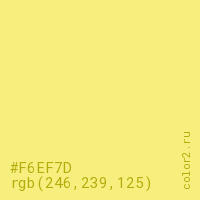 Цвет #F6EF7D в цветовой модели RGB обозначается тремя октетами (246, 239, 125) в десятичном формате и #F6EF7D в шестнадцатиричном (hex) формате, которые являются интенсивностью красного 246 (hex F6), интенсивность зелёного 239 (hex EF) и интенсивность синего 125 (hex 7D).