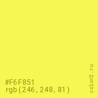 Цвет #F6F851 в цветовой модели RGB обозначается тремя октетами (246, 248, 81) в десятичном формате и #F6F851 в шестнадцатиричном (hex) формате, которые являются интенсивностью красного 246 (hex F6), интенсивность зелёного 248 (hex F8) и интенсивность синего 81 (hex 51).