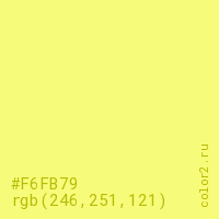 Цвет #F6FB79 в цветовой модели RGB обозначается тремя октетами (246, 251, 121) в десятичном формате и #F6FB79 в шестнадцатиричном (hex) формате, которые являются интенсивностью красного 246 (hex F6), интенсивность зелёного 251 (hex FB) и интенсивность синего 121 (hex 79).
