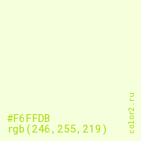 Цвет #F6FFDB в цветовой модели RGB обозначается тремя октетами (246, 255, 219) в десятичном формате и #F6FFDB в шестнадцатиричном (hex) формате, которые являются интенсивностью красного 246 (hex F6), интенсивность зелёного 255 (hex FF) и интенсивность синего 219 (hex DB).