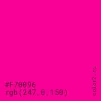 Цвет #F70096 в цветовой модели RGB обозначается тремя октетами (247, 0, 150) в десятичном формате и #F70096 в шестнадцатиричном (hex) формате, которые являются интенсивностью красного 247 (hex F7), интенсивность зелёного 0 (hex 00) и интенсивность синего 150 (hex 96).
