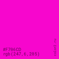 Цвет #F706CD в цветовой модели RGB обозначается тремя октетами (247, 6, 205) в десятичном формате и #F706CD в шестнадцатиричном (hex) формате, которые являются интенсивностью красного 247 (hex F7), интенсивность зелёного 6 (hex 06) и интенсивность синего 205 (hex CD).