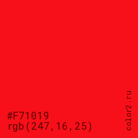 Цвет #F71019 в цветовой модели RGB обозначается тремя октетами (247, 16, 25) в десятичном формате и #F71019 в шестнадцатиричном (hex) формате, которые являются интенсивностью красного 247 (hex F7), интенсивность зелёного 16 (hex 10) и интенсивность синего 25 (hex 19).