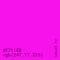 Цвет #F711EB в цветовой модели RGB обозначается тремя октетами (247, 17, 235) в десятичном формате и #F711EB в шестнадцатиричном (hex) формате, которые являются интенсивностью красного 247 (hex F7), интенсивность зелёного 17 (hex 11) и интенсивность синего 235 (hex EB).