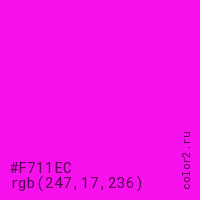 Цвет #F711EC в цветовой модели RGB обозначается тремя октетами (247, 17, 236) в десятичном формате и #F711EC в шестнадцатиричном (hex) формате, которые являются интенсивностью красного 247 (hex F7), интенсивность зелёного 17 (hex 11) и интенсивность синего 236 (hex EC).