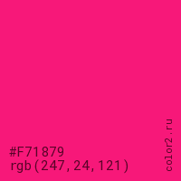 Цвет #F71879 в цветовой модели RGB обозначается тремя октетами (247, 24, 121) в десятичном формате и #F71879 в шестнадцатиричном (hex) формате, которые являются интенсивностью красного 247 (hex F7), интенсивность зелёного 24 (hex 18) и интенсивность синего 121 (hex 79).