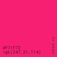 Цвет #F71F72 в цветовой модели RGB обозначается тремя октетами (247, 31, 114) в десятичном формате и #F71F72 в шестнадцатиричном (hex) формате, которые являются интенсивностью красного 247 (hex F7), интенсивность зелёного 31 (hex 1F) и интенсивность синего 114 (hex 72).