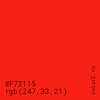 Цвет #F72115 в цветовой модели RGB обозначается тремя октетами (247, 33, 21) в десятичном формате и #F72115 в шестнадцатиричном (hex) формате, которые являются интенсивностью красного 247 (hex F7), интенсивность зелёного 33 (hex 21) и интенсивность синего 21 (hex 15).