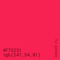 Цвет #F72251 в цветовой модели RGB обозначается тремя октетами (247, 34, 81) в десятичном формате и #F72251 в шестнадцатиричном (hex) формате, которые являются интенсивностью красного 247 (hex F7), интенсивность зелёного 34 (hex 22) и интенсивность синего 81 (hex 51).