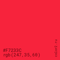 Цвет #F7233C в цветовой модели RGB обозначается тремя октетами (247, 35, 60) в десятичном формате и #F7233C в шестнадцатиричном (hex) формате, которые являются интенсивностью красного 247 (hex F7), интенсивность зелёного 35 (hex 23) и интенсивность синего 60 (hex 3C).
