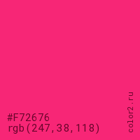 Цвет #F72676 в цветовой модели RGB обозначается тремя октетами (247, 38, 118) в десятичном формате и #F72676 в шестнадцатиричном (hex) формате, которые являются интенсивностью красного 247 (hex F7), интенсивность зелёного 38 (hex 26) и интенсивность синего 118 (hex 76).