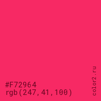 Цвет #F72964 в цветовой модели RGB обозначается тремя октетами (247, 41, 100) в десятичном формате и #F72964 в шестнадцатиричном (hex) формате, которые являются интенсивностью красного 247 (hex F7), интенсивность зелёного 41 (hex 29) и интенсивность синего 100 (hex 64).