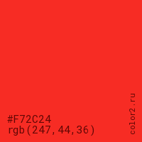 Цвет #F72C24 в цветовой модели RGB обозначается тремя октетами (247, 44, 36) в десятичном формате и #F72C24 в шестнадцатиричном (hex) формате, которые являются интенсивностью красного 247 (hex F7), интенсивность зелёного 44 (hex 2C) и интенсивность синего 36 (hex 24).