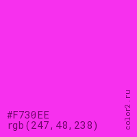 Цвет #F730EE в цветовой модели RGB обозначается тремя октетами (247, 48, 238) в десятичном формате и #F730EE в шестнадцатиричном (hex) формате, которые являются интенсивностью красного 247 (hex F7), интенсивность зелёного 48 (hex 30) и интенсивность синего 238 (hex EE).