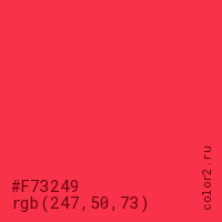 Цвет #F73249 в цветовой модели RGB обозначается тремя октетами (247, 50, 73) в десятичном формате и #F73249 в шестнадцатиричном (hex) формате, которые являются интенсивностью красного 247 (hex F7), интенсивность зелёного 50 (hex 32) и интенсивность синего 73 (hex 49).