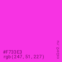 Цвет #F733E3 в цветовой модели RGB обозначается тремя октетами (247, 51, 227) в десятичном формате и #F733E3 в шестнадцатиричном (hex) формате, которые являются интенсивностью красного 247 (hex F7), интенсивность зелёного 51 (hex 33) и интенсивность синего 227 (hex E3).