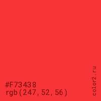 Цвет #F73438 в цветовой модели RGB обозначается тремя октетами (247, 52, 56) в десятичном формате и #F73438 в шестнадцатиричном (hex) формате, которые являются интенсивностью красного 247 (hex F7), интенсивность зелёного 52 (hex 34) и интенсивность синего 56 (hex 38).