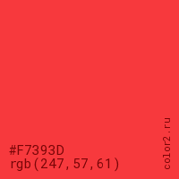 Цвет #F7393D в цветовой модели RGB обозначается тремя октетами (247, 57, 61) в десятичном формате и #F7393D в шестнадцатиричном (hex) формате, которые являются интенсивностью красного 247 (hex F7), интенсивность зелёного 57 (hex 39) и интенсивность синего 61 (hex 3D).