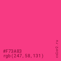 Цвет #F73A83 в цветовой модели RGB обозначается тремя октетами (247, 58, 131) в десятичном формате и #F73A83 в шестнадцатиричном (hex) формате, которые являются интенсивностью красного 247 (hex F7), интенсивность зелёного 58 (hex 3A) и интенсивность синего 131 (hex 83).