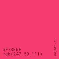 Цвет #F73B6F в цветовой модели RGB обозначается тремя октетами (247, 59, 111) в десятичном формате и #F73B6F в шестнадцатиричном (hex) формате, которые являются интенсивностью красного 247 (hex F7), интенсивность зелёного 59 (hex 3B) и интенсивность синего 111 (hex 6F).