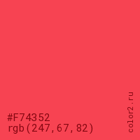 Цвет #F74352 в цветовой модели RGB обозначается тремя октетами (247, 67, 82) в десятичном формате и #F74352 в шестнадцатиричном (hex) формате, которые являются интенсивностью красного 247 (hex F7), интенсивность зелёного 67 (hex 43) и интенсивность синего 82 (hex 52).