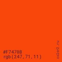 Цвет #F7470B в цветовой модели RGB обозначается тремя октетами (247, 71, 11) в десятичном формате и #F7470B в шестнадцатиричном (hex) формате, которые являются интенсивностью красного 247 (hex F7), интенсивность зелёного 71 (hex 47) и интенсивность синего 11 (hex 0B).