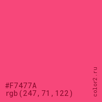 Цвет #F7477A в цветовой модели RGB обозначается тремя октетами (247, 71, 122) в десятичном формате и #F7477A в шестнадцатиричном (hex) формате, которые являются интенсивностью красного 247 (hex F7), интенсивность зелёного 71 (hex 47) и интенсивность синего 122 (hex 7A).
