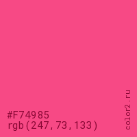 Цвет #F74985 в цветовой модели RGB обозначается тремя октетами (247, 73, 133) в десятичном формате и #F74985 в шестнадцатиричном (hex) формате, которые являются интенсивностью красного 247 (hex F7), интенсивность зелёного 73 (hex 49) и интенсивность синего 133 (hex 85).