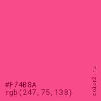 Цвет #F74B8A в цветовой модели RGB обозначается тремя октетами (247, 75, 138) в десятичном формате и #F74B8A в шестнадцатиричном (hex) формате, которые являются интенсивностью красного 247 (hex F7), интенсивность зелёного 75 (hex 4B) и интенсивность синего 138 (hex 8A).