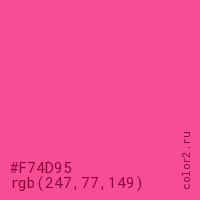Цвет #F74D95 в цветовой модели RGB обозначается тремя октетами (247, 77, 149) в десятичном формате и #F74D95 в шестнадцатиричном (hex) формате, которые являются интенсивностью красного 247 (hex F7), интенсивность зелёного 77 (hex 4D) и интенсивность синего 149 (hex 95).