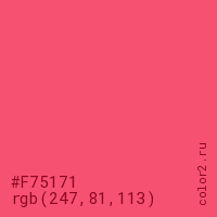 Цвет #F75171 в цветовой модели RGB обозначается тремя октетами (247, 81, 113) в десятичном формате и #F75171 в шестнадцатиричном (hex) формате, которые являются интенсивностью красного 247 (hex F7), интенсивность зелёного 81 (hex 51) и интенсивность синего 113 (hex 71).