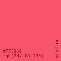 Цвет #F75369 в цветовой модели RGB обозначается тремя октетами (247, 83, 105) в десятичном формате и #F75369 в шестнадцатиричном (hex) формате, которые являются интенсивностью красного 247 (hex F7), интенсивность зелёного 83 (hex 53) и интенсивность синего 105 (hex 69).