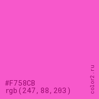 Цвет #F758CB в цветовой модели RGB обозначается тремя октетами (247, 88, 203) в десятичном формате и #F758CB в шестнадцатиричном (hex) формате, которые являются интенсивностью красного 247 (hex F7), интенсивность зелёного 88 (hex 58) и интенсивность синего 203 (hex CB).