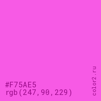 Цвет #F75AE5 в цветовой модели RGB обозначается тремя октетами (247, 90, 229) в десятичном формате и #F75AE5 в шестнадцатиричном (hex) формате, которые являются интенсивностью красного 247 (hex F7), интенсивность зелёного 90 (hex 5A) и интенсивность синего 229 (hex E5).