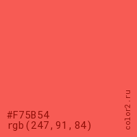 Цвет #F75B54 в цветовой модели RGB обозначается тремя октетами (247, 91, 84) в десятичном формате и #F75B54 в шестнадцатиричном (hex) формате, которые являются интенсивностью красного 247 (hex F7), интенсивность зелёного 91 (hex 5B) и интенсивность синего 84 (hex 54).